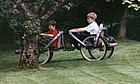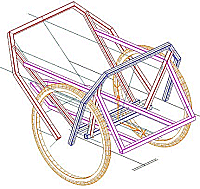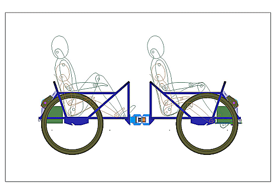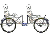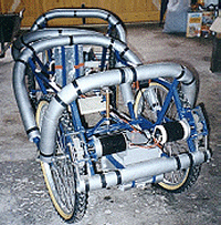 Built for my primary school aged sons the “Buggy” is a two-boy/girl battery powered 4WD tandem off-roader. Rather unusual in appearance the design has features required for effective off-road use. The design is also strongly influenced by cost and manufacturability constraints. (It's as cheap as I could make it with basic metal working tools.) As an electric vehicle it’s quiet and clean in operation and easy to keep (no IC engine to maintain). The articulated two-frame arrangement allows steering without the need for complex steering components and continuous 4 wheel ground contact without complex suspension components. This makes it easier to make and limits cost. It does have disadvantages for stability on cornering but these are overcome by mechanically limiting the articulation angles (steering and twist). 24” mountain bike wheels provide good grip, capability for climbing kerb-sized steps and generous ground clearance. They are lightweight and are easy to source. Each wheel is driven independently by a DC PM motor; a 4WD arrangement